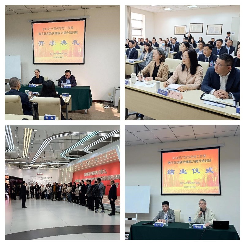 4 月 1 日,东航资产宣传思想工作暨数字化创新传播能力提升培训班开学典礼在卿云宾馆举行。东航资产董事、党委副书记、副总经理陈卓,胡波院长出席开班式。胡院长代表学校致辞,对 54 名来自东航资产公司宣传战线、党务条线及品牌工作项目的学员表示欢迎,他从干部教育是复旦大学的重要任务、干部教育培训工作是大学与社会的双向奔赴、培训学员是复旦大学宝贵的校友财富三个方面向与座领导及学员介绍了学校干部培训工作的相关情况。陈卓副书记作动员讲话,她希望所有学员能够加强思想认识,切实落实行动,以培训促提高,真正实现深入学习贯彻党的二十大精神,巩固拓展主题教育成果的目的,进一步凝聚对公司新板块、新使命、新任务的共识,深化对新领域、新媒介、新技术的理解,着力锻造高素质专业化的宣传工作队伍,为推动东航资产从“融合”向“融活”转变厚植内生动力、营造良好氛围。