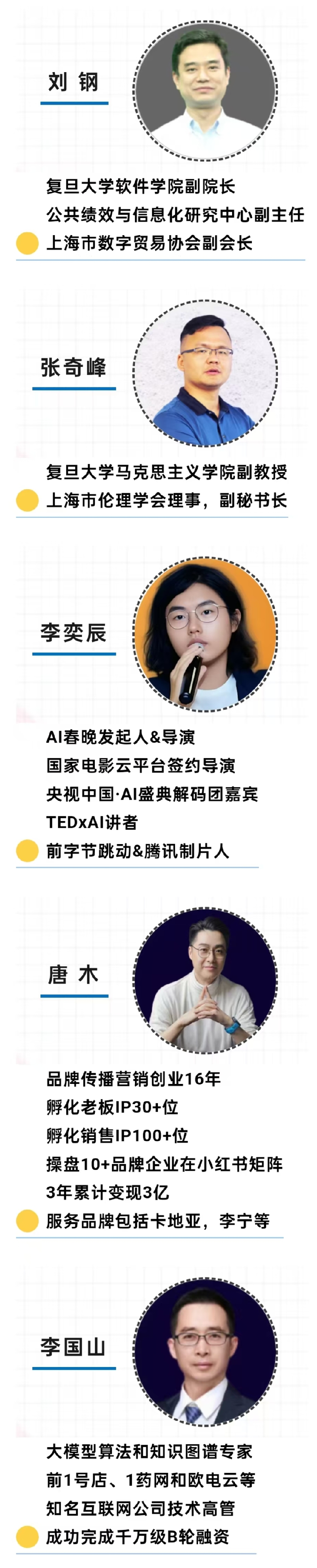 本课程是由复旦大学终身教育学院精心打造的非学历教育项目,汇聚了校内外的顶尖专家教授,人工智能、知名电商和自媒体领域的行业大咖。课程旨在帮助企业家和高管升级思维方式,提升AI领导力,增强实战经验,并深入掌握前沿的AI工具和技术,精准打造和推广企业品牌(IP),显著提升将AI技术高效应用于商业场景的能力,从而推动企业创新发展,增强企业在行业中的竞争力。