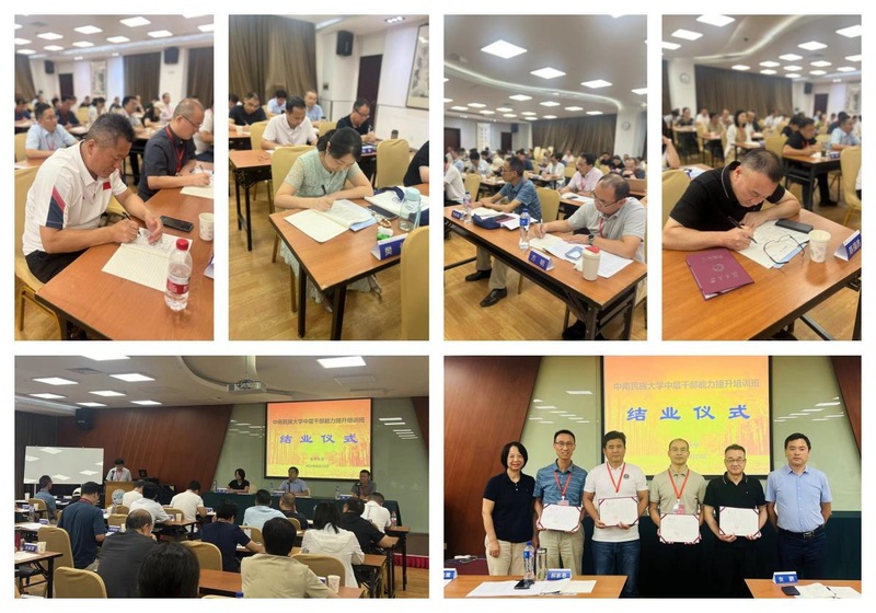 8月23日下午,研修班结业仪式如期举行。中南民族大学党委副书记、副校长三朗扎西,继续教育学院副院长李辉参加结业仪式。4 位学员代表分别从中层干部服务学校发展大局、党建工作与学校事业发展深度融合、高水平引才育才工作、推进学科专业转型升级等角度交流发言,分享学习体会。三朗扎西副书记与李辉副院长分别代表两校致辞,并为学员代表颁发结业证书。