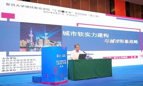 继今年5月复旦大学继续教育学院着力打造的“汇智•未来”系列讲座首期成功举办以来,得到了社会各界的广泛关注和支持。为深入学习和贯彻党的二十届三中全会精神,2024年8月17日,“汇智•未来”系列讲座(第二期)在安徽滁州如约举行。本次活动由复旦大学继续教育学院、复旦大学中国式现代化行动研究实验基地——长三角人文经济研究(琅琊区)和中共滁州市委组织部、琅琊区委、区人民政府共同举办。