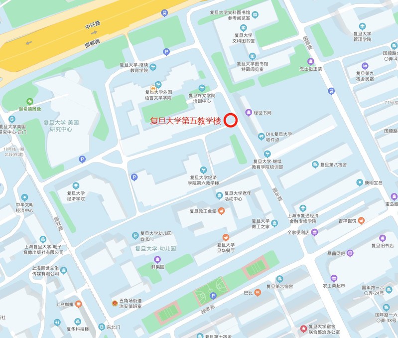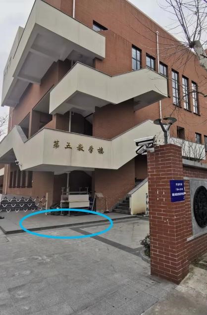 2、具体办理地点在复旦大学第五教学楼(国年路,参见下图定位图示)边,请在第五教学楼栅栏外的等候区(参见第五教学楼图片蓝色圈标)拨打办公电话65643139或65642056,学院工作人员在接到电话后会前来此处接待办理,请耐心等候。