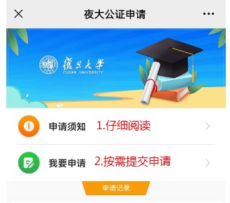 3、点击“夜大公证申请”,申请前请仔细阅读“申请须知”,以免因递交材料不符合要求被退回而影响办理进度。
